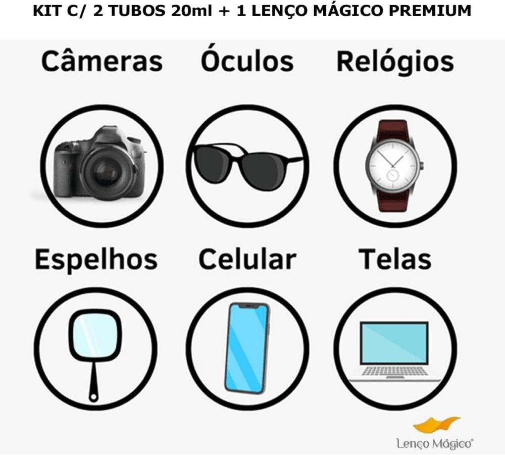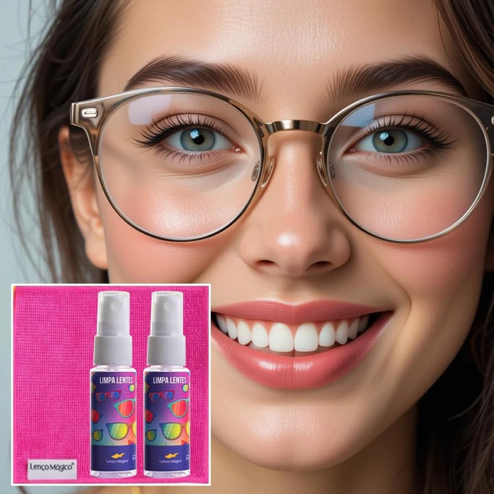 1️⃣ Kit Completo: 2 Unidades Spray Limpa Lente ECo 20ml + 1 Lenço Mágico Premium 15x15cm para limpeza eficiente de óculos, celulares, câmeras e eletrônicos em geral.