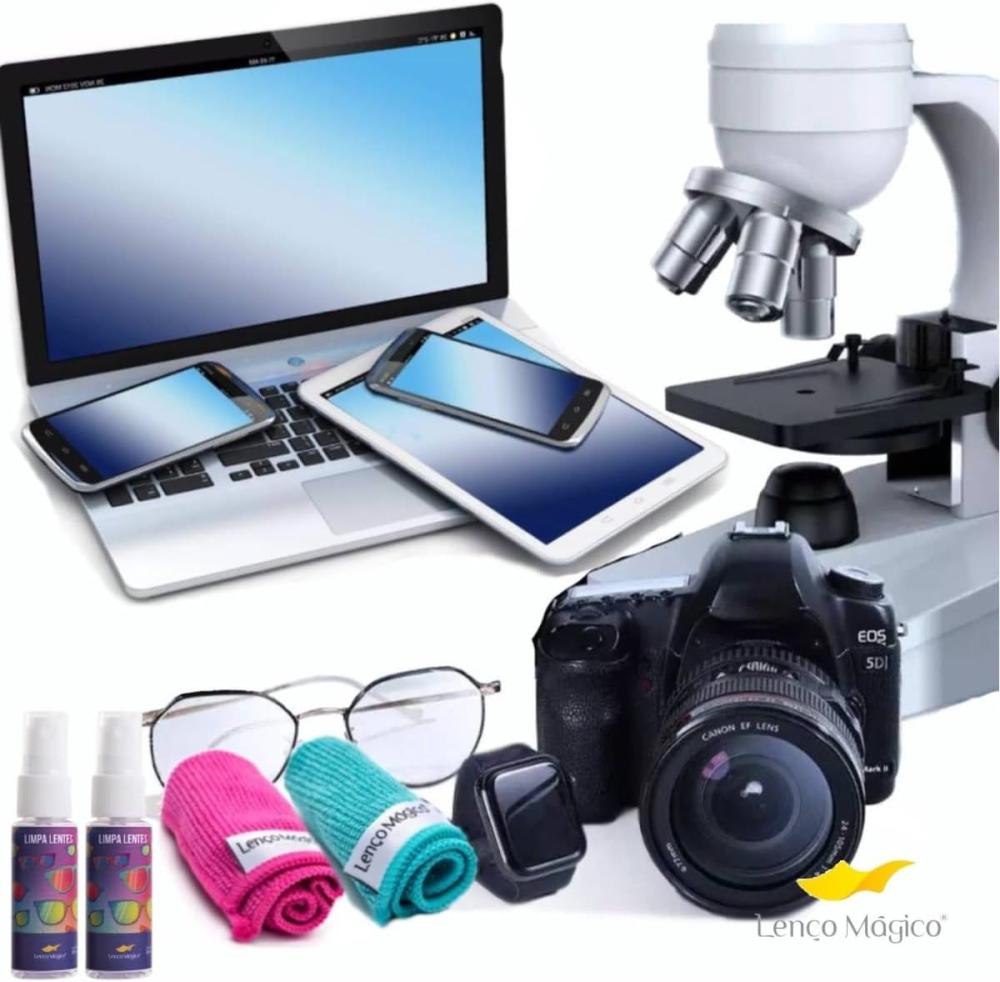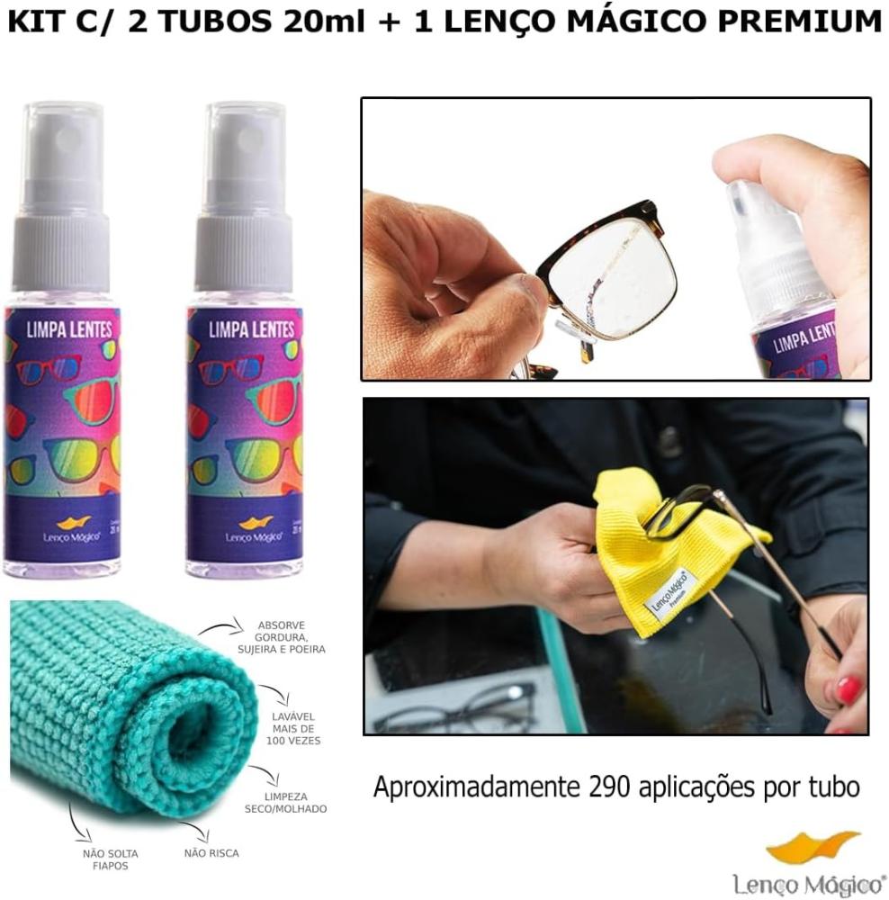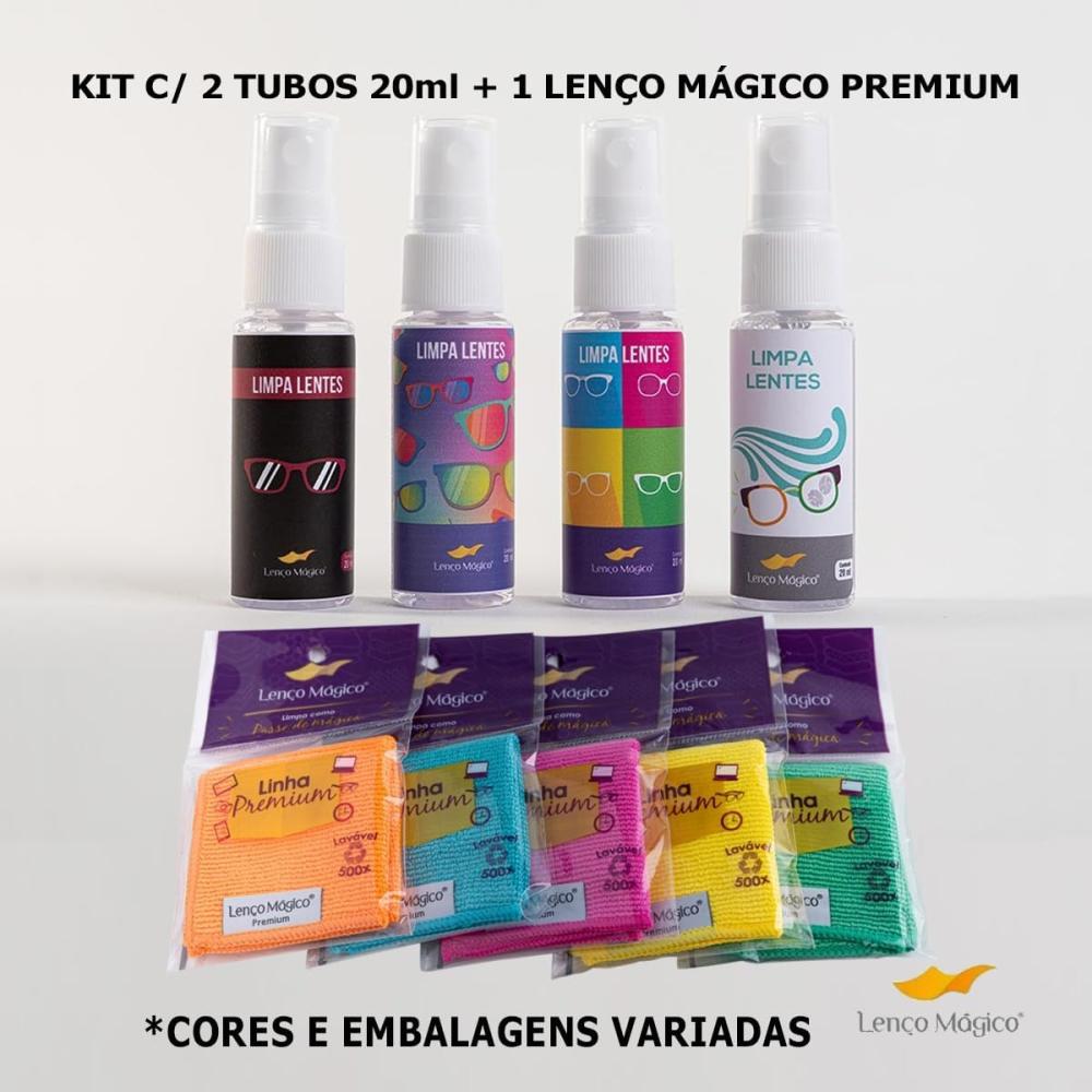 Kit c/ 2 Spray Limpa Lente ECo 20ml By Lenço Mágico e 1 Lenço Mágico Premium 15x15cm Original Limpa Óculos Celular Câmera Lentes Eletrônicos Maior Absorção Maciez Lavável - Cores e Embalagens Variadas
